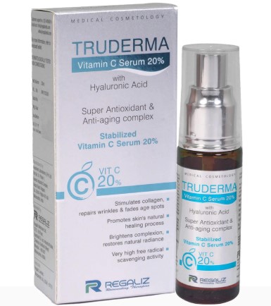 Truderma Vitamin C Serum fortified with Hyaluronic acid contains the most stable form of Vitamin C. Truderma Vitamin C serum is fortified with super Anti-oxidant complex and provides anti-aging benefits